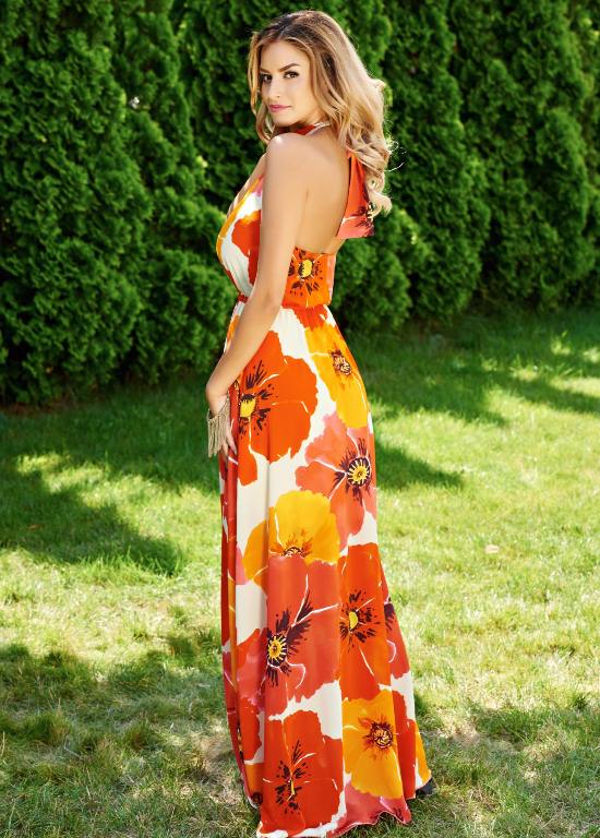 Rochie lunga cu spatele gol, se leaga dupa gat, imprimata cu flori, material superb vaporos, sexy, pune corpul in evidenta vezi pret