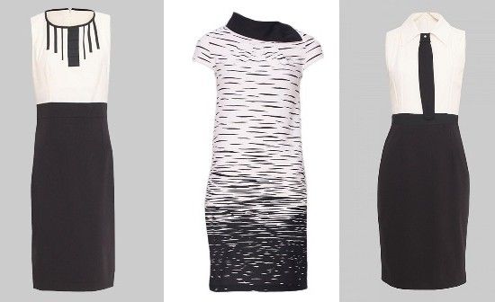 Rochii office Nissa in eleganta combinatie alb-negru perfecte pentru birou, marcheaza talia, urmaresc linia corpului, iar detaliile contrast de la gat le scot din obisnuit. Alegeti pantofi bej cu toc inalt sau rosii daca sunteti mai curajoase.