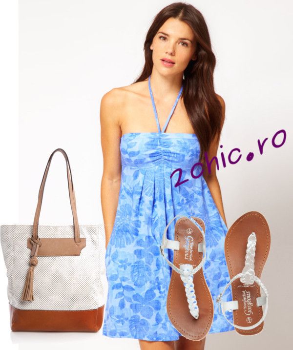 Rochie bleu cu accesorii - slapi, geanta maro-alb