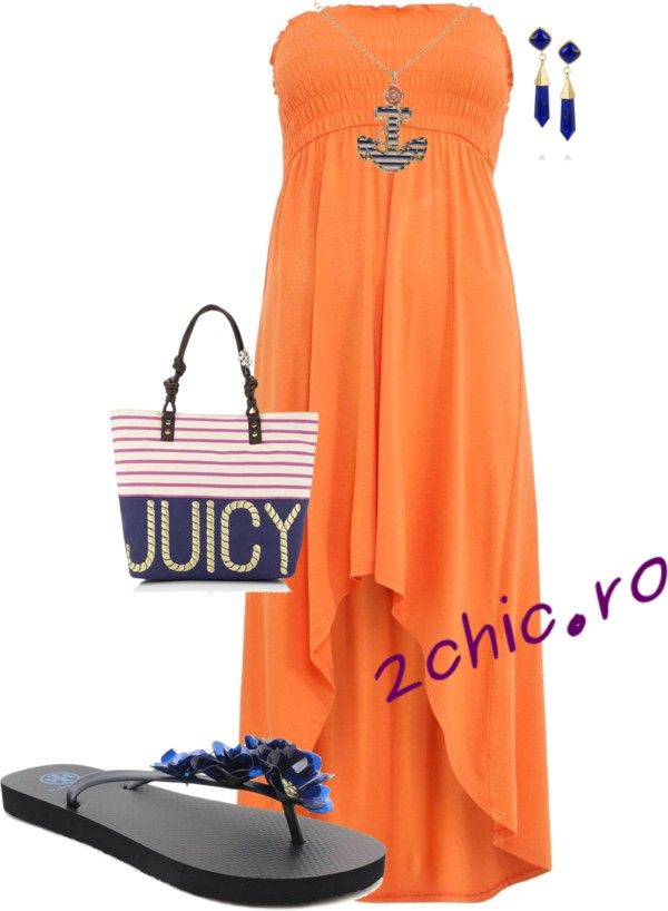 Rochie portocalie, geanta de plaja albastra, cercei si colier