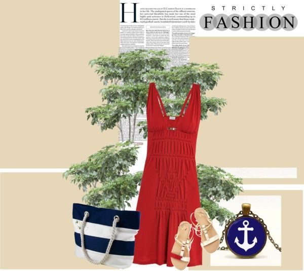 Rochie rosie cu geanta de plaja alb-bleumarin si colier marin