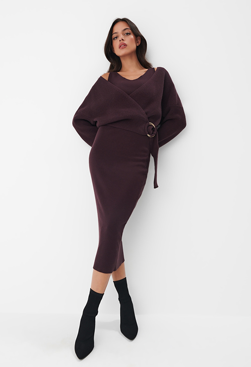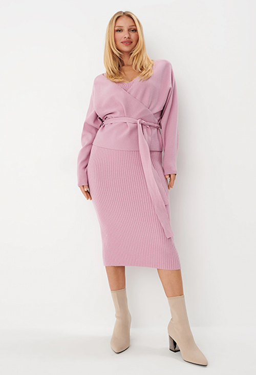 Set tricotat lila cu rochie mulata și cardigan cu cordon – vezi preț